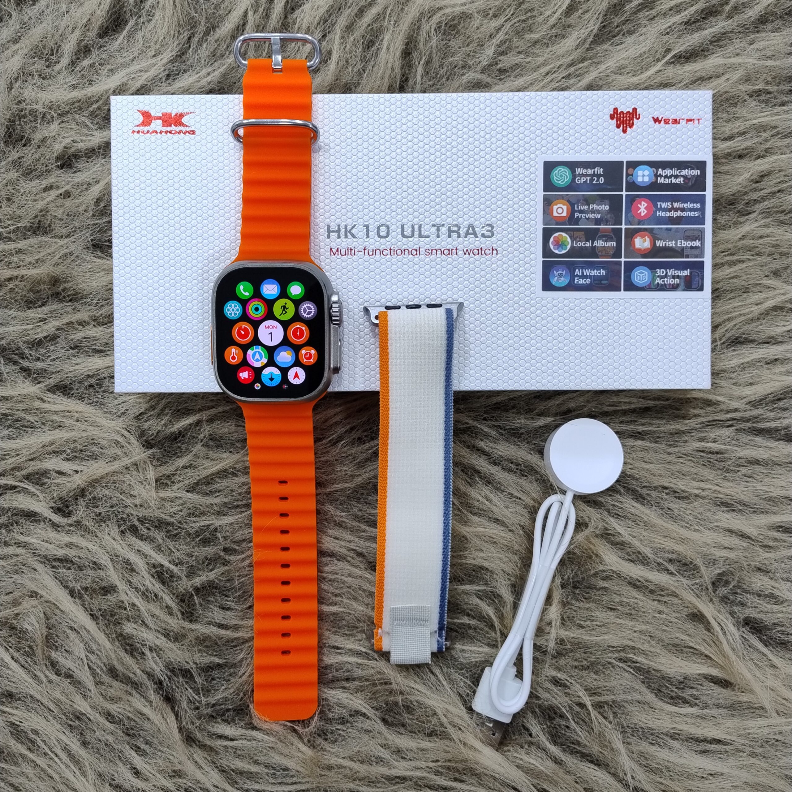 ساعت هوشمند طرح اپل واچ الترا مدل HK10 Ultra3 با بدنه آلومینیوم، صفحه نمایش ۲.۱ اینچی AMOLED همیشه روشن، قابلیت مکالمه بلوتوثی، پشتیبانی از منو و اعلانات فارسی، حافظه داخلی، سنسورهای سلامتی کامل (ضربان قلب، اکسیژن خون، فشار خون، قند خون، پایش خواب، گام شمار و کالری شمار)، سازگار با iOS و اندروید، و شارژ بی‌سیم انتخابی بی‌نظیر برای هدیه و استفاده روزانه است.